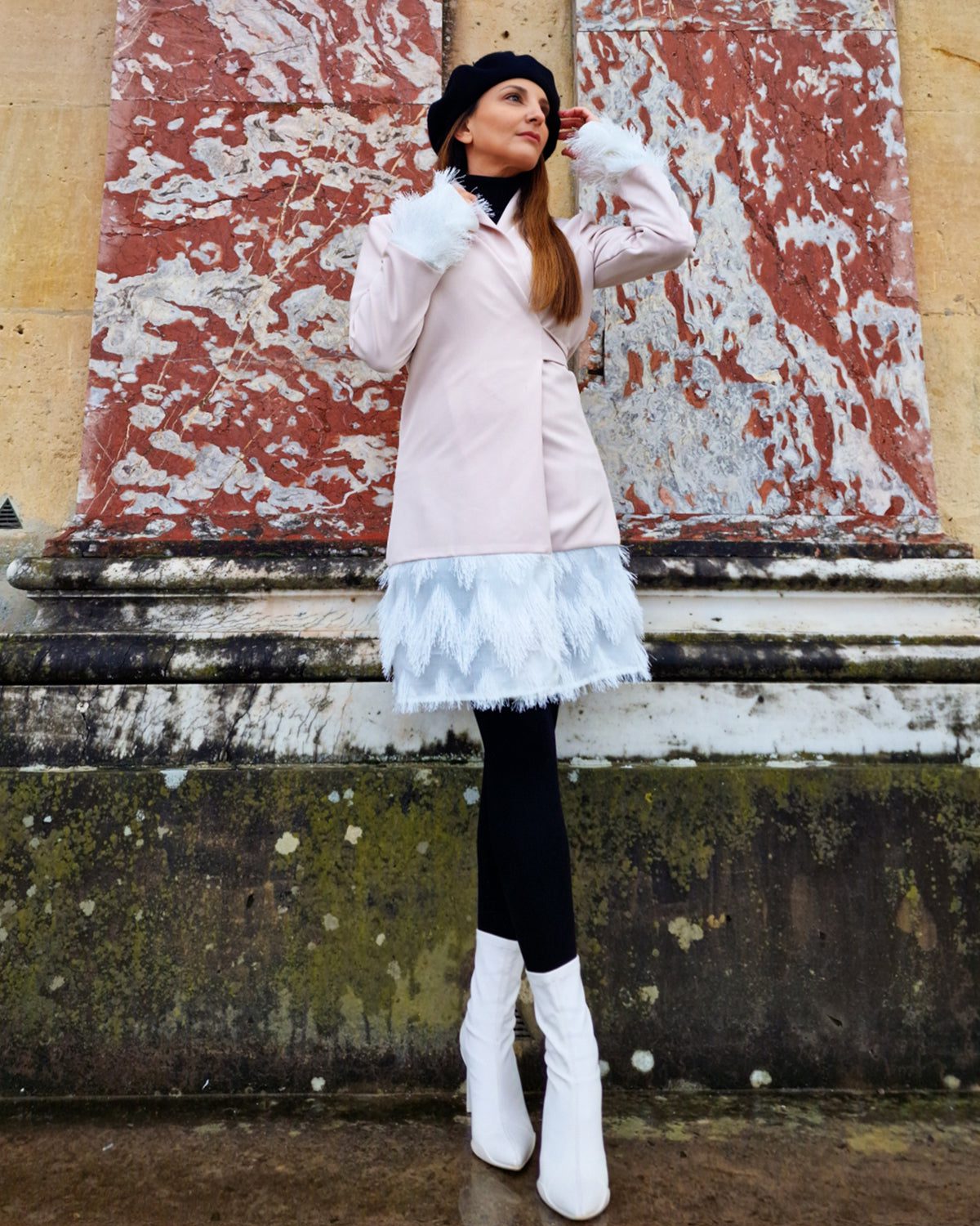 - Στα μανίκια έχει λευκά κρόσσια