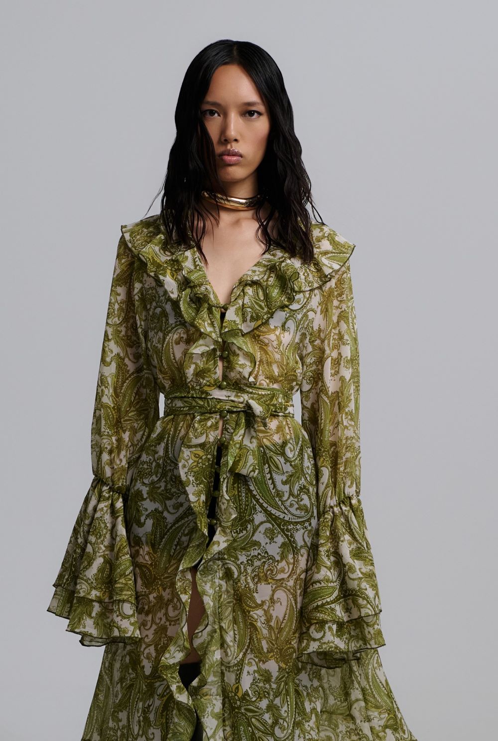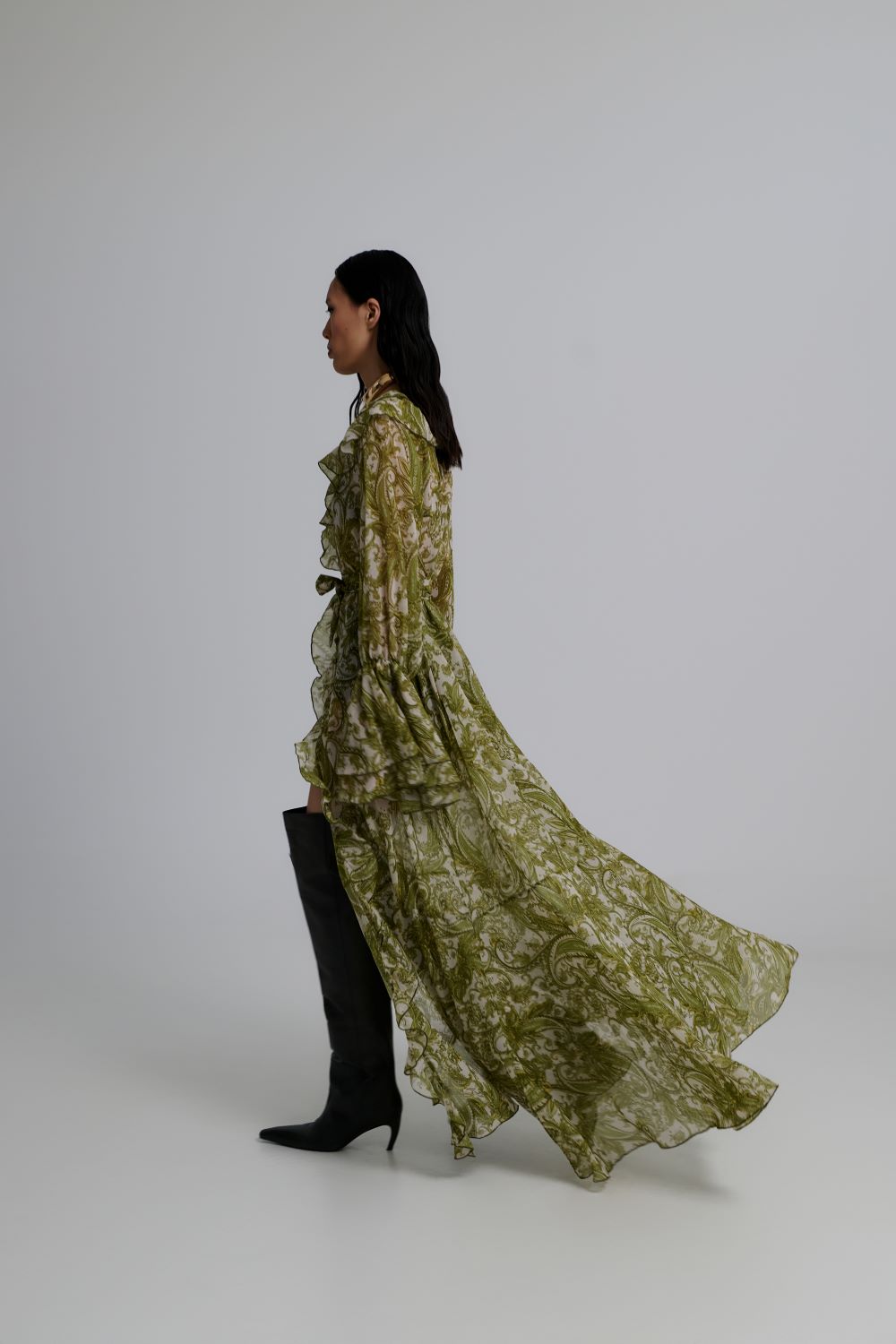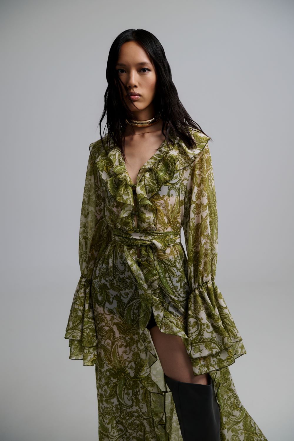 - Κλείνει με κουμπιά έως τη μέση του φορέματος